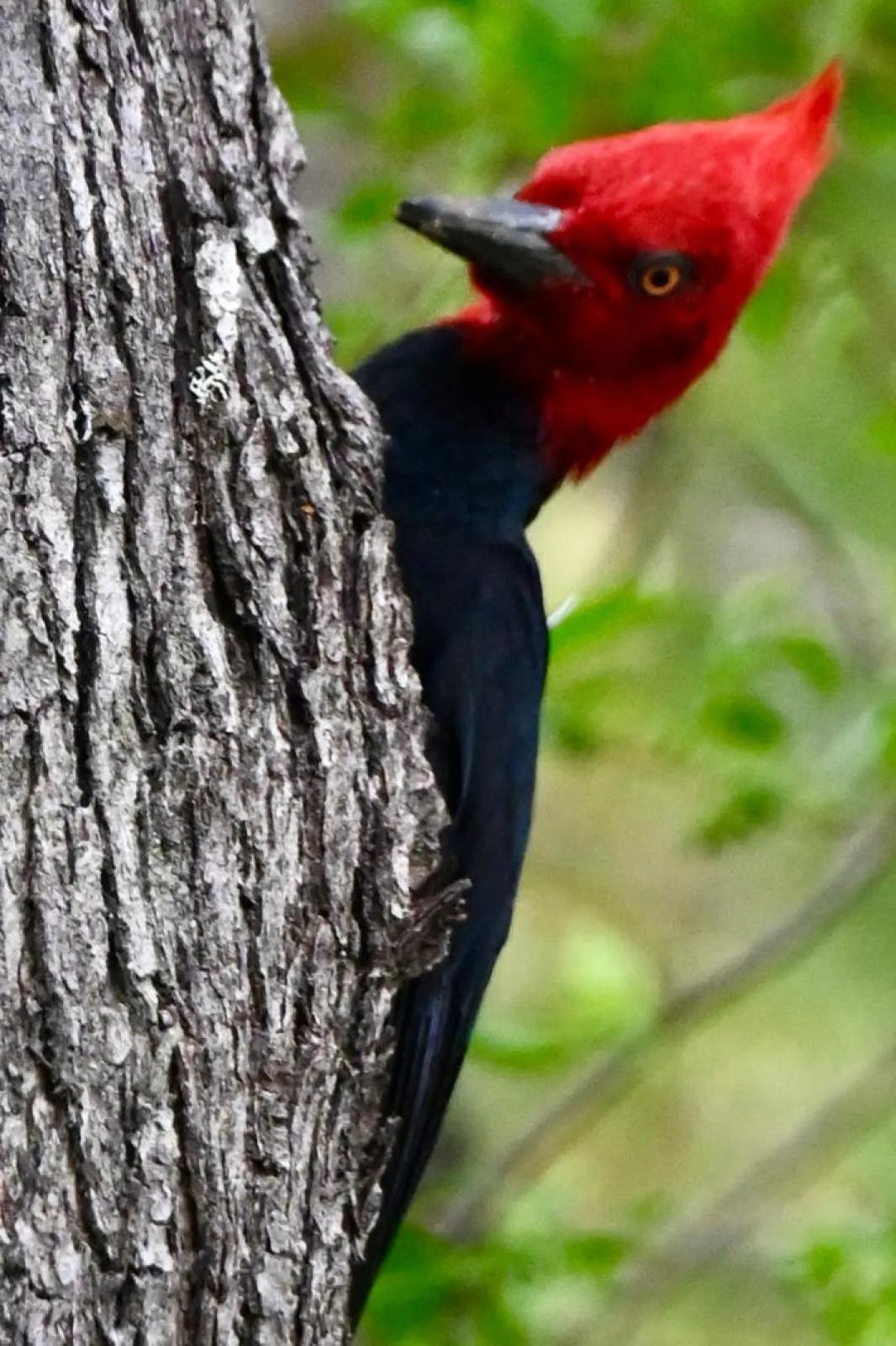 Una coppia di picchi (Carpintero gigante) martella freneticamente il tronco di un albero per tirarne fuori insetti, il chucao grassottello becca semini. Cartelli annunciano la presenza del puma ma, per fortuna, l’avviso va disatteso.