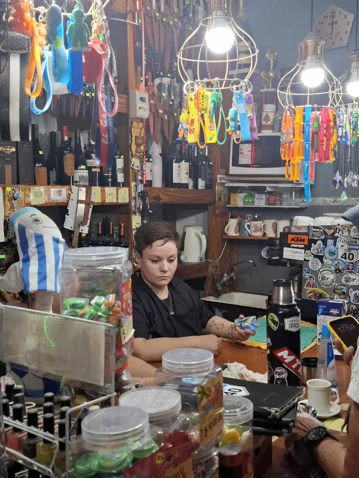 Rare pompe di benzina con piccoli posti di ristoro, a volte con camere per i viaggiatori, interrompono la monotonia del brullo paesaggio. Adesivi di posti del mondo, tour operator, strade, targhe… ricoprono ogni superficie possibile.