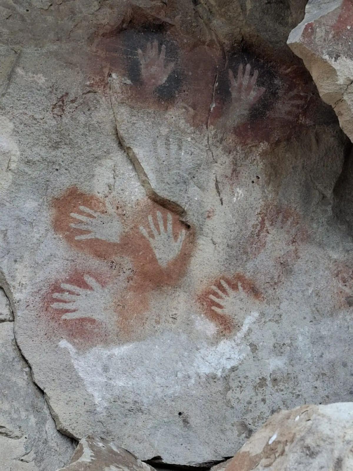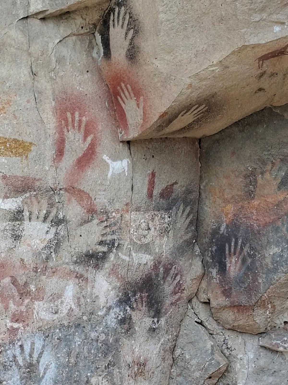 La zona più spettacolare è la valle del Rio Pinturas, dove ci rechiamo per visitare la “Cueva de las Manos Pintadas”, considerata la Cappella Sistina de los Antiguos, gli antenati di questi luoghi, cacciatori nomadi che vissero qui già 9000 anni fa. Centinaia di impronte di mani in negativo, riprodotte in vari colori, si alternano a scene di caccia, animali, figure umane stilizzate. Gli stili differenti permettono di identificare tre periodi storici, che vanno da circa 10.000 fino a 2500 anni fa. Una delle iconografie delle mani è stata utilizzata come copertina del libro di Chatwin “In Patagonia”.
